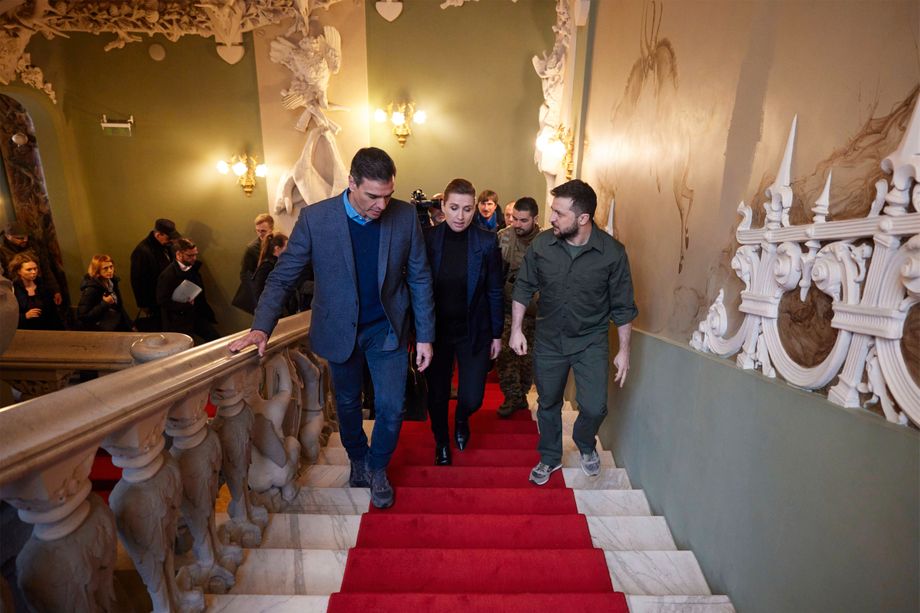 Einen Tag später empfing Selenskyj den spanischen Ministerpräsidenten Pedro Sánchez und die dänische Regierungschefin Mette Frederiksen. Sánchez und Frederiksen kündigten weitere Waffen- und Munitionslieferungen in das Kriegsgebiet an.