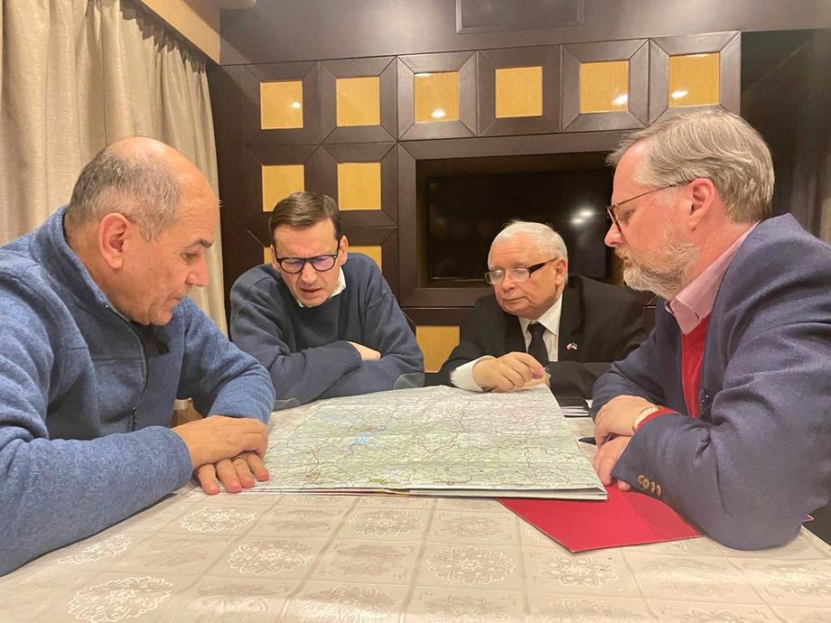 Sloweniens Premier Janez Janša (inzwischen abgewählt), Polens Ministerpräsident Mateusz Morawiecki, sein Stellvertreter Jarosław Kaczyński, und der tschechische Regierungschef Petr Fialia (v.l.) beugen sich über eine Karte der Ukraine: Die Politiker waren am 15. März die ersten ausländischen Regierungschefs, die sich nach dem russischen Angriff auf die Ukraine auf den Weg in das Kriegsgebiet machten. Dies wurde als große Geste der Solidarität empfunden.