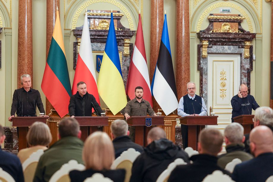 Der litauische Präsident Gitanas Nausėda mit seinem polnischen Amtskollegen Andrzej Duda, Selenskyj, dem lettischen Staatsoberhaupt Egils Levits und dem estnischen Präsidenten Alar Karis bei einer Pressekonferenz am 13. April in der ukrainischen Hauptstadt: Dieses Treffen war aus deutscher Sicht bemerkenswert – Bundespräsident Frank-Walter Steinmeier, der seine polnischen und baltischen Kollegen hatte begleiten wollen, war zuvor von der Ukraine ausgeladen worden. Grund dafür war die Russlandpolitik Steinmeiers, als er noch Kanzleramtschef und Außenminister war.