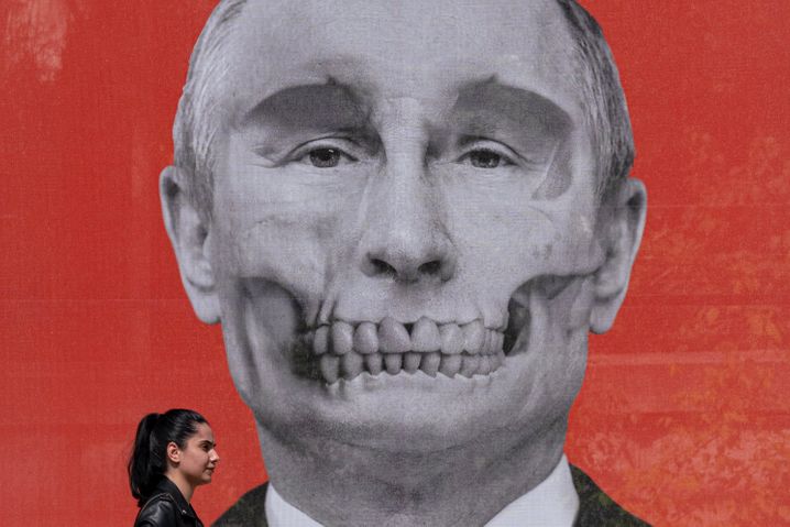 Protest-Bild gegen Wladimir Putin vor der russischen Botschaft in Bukarest