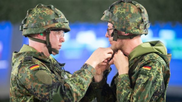 Ein Bundeswehrsoldat (l.) hilft einem Zivilisten bei einem Reservisten-Projekt auf dem Truppenübungsplatz Hammelburg Foto: Sebastian Gollnow / dpa Kanzler Olaf Scholz (SPD) hat eine »Zeitenwende«...